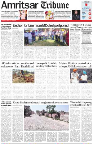 05042025-ATR-01.qxd 4/4/2025 11:24 PM Page 1 c m y b Amritsar tribune FORECAST MAINLY CLEAR SGPC PRESIDENT INAUGURATES NEW PNB BUILDING BOLLYWOOD PRODUCER KARAN JOHAR VISITS THE GOLDEN TEMPLE TOM CRUISE OPENS CINEMACON SPEECH WITH MOMENT OF SILENCE SGPC president Harjinder Singh Dhami inaugurated renovated branch of the PNB near Gurdwara Baba Atal Rai Sahib. P2 Punjabi actor-singer Gippy Grewal and Bollywood producer Karan Johar on Friday paid obeisance at the Golden Temple. P4 Tom Cruise opened his highly anticipated CinemaCon appearance with a moving tribute to his Top Gun co-star, Val Kilmer.P4 » » » MAX 34°C | MIN 16°C YESTERDAY MAX 33°C | MIN 14°C SUNSET SATURDAY 6.52 PM SUNRISE SUNDAY 6:12 AM SATURDAY | 5 APRIL 2025 | AMRITSAR Two arrested with 450 gm opium in Tarn Taran village Election for Tarn Taran MC chief postponed Gurbaxpuri Our Correspondent Tarn Taran, April 4 The Harike police led by Assistant Sub-Inspector Gurinder Singh arrested two car-borne persons with 450 grams of opium on Thursday near a village in Taran Tarn district. The police said the arrested accused were identified as Prabhsimran Singh, a resident of Jandiala Guru Road, and Barinder Singh Banni, a resident of Kajikot Road in Tarn Taran district. The police said the accused, who were travelling in a car, were stopped for checking at a naka. During search, the police recovered 450 grams of opium from the possession of the two accused. A case under the Narcotic Drugs and Psychotropic Substances Act was registered against the two accused, the police said. Tarn Taran, April 4 The election for the president of the Tarn Taran Municipal Council (MC) has become a severe headache for the state government and the district administration. This election, which was to be held today (Friday), was postponed due to busy schedule of the Election Convener-cum-SDM, Tarn Taran, at the Punjab and Haryana High Court. A letter in this regard was issued by the office of the SDM vide order No. 4372, April 3, 2025. Most councillors, especially Independents, were unaware of the development. Councillors were apprised about postponing of the election by Executive Officer (EO) Randeep Singh Waraich when they came to attend the first meeting of the MC House today. Eighteen councillors associated with Dr Kashmir Singh Sohal, Tarn Taran MLA, opposed postponement of the PSEB Class VIII annual exams: Three girl students from dist in state merit list Tribune News Service Councillors owing allegiance to MLA Dr Kashmir Singh Sohal group protest postponing of the MC president’s election in Tarn Taran. MC president’s election and raised slogans against the administration. Sarbrinder Singh Bharowal, a leader of the MLA group, while addressing councillors at the MC office today alleged that distribution of hefty cash and interference of AAP leaders led to postponement of the election just to defame Dr Kashmir Singh Sohal. Sohal too condemned the role of the outsider AAP leaders and a minister in this connection. As per neutral circles, there were sharp differences among top AAP leaders. In the 25-member MC House there are only eight members of the ruling AAP , 14 are Independents and three members belong to the Congress. The MC House is divided between two groups of councillors, one led by Dr Kashmir Singh Sohal and another by a Cabinet Minister, who has the support of many senior party leaders. Both the groups frequently indulge in a tug-of-war. Since last three weeks, both groups have been trying to lure other councillors to come to their respective sides. Meanwhile, the next date for the MC chief election has not been fixed. The administration had made all arrangements for the MC House meeting in the early morning today. Amritsar, April 4 Three students from the district made it to the state merit list, securing second rank in the state as the Punjab School Education Board (PSEB) Class VIII annual examination results were declared today. Navjot Kaur, Harnoor Kaur and Sarojdeep Kaur, all students of Guru Nanak Public Senior Secondary School, Chanan Ke, Amritsar, secured second position in the state merit list by scoring 599 (99.83 per cent) out of 600 marks . Puneet Verma of Sri Harkrishan Public School, Model Town, Hoshiarpur, scored 100 per cent marks to bag the top spot in the PSEB Class VIII annual examination, while Navjot Kaur of Sant Mohan Das Memorial Senior Secondary School, Kot Santhian, Faridkot, also scored 2,90,471 STUDENTS APPEARED IN EXAM In all, 2,90,471 students from 10,471 schools of Punjab appeared in the PSEB Class VIII annual examination held recently of which 2,82,627 cleared the exam with a pass percentage of 97.30 per cent. The complete result has been uploaded on the PSEB website. 100 per cent marks, but was adjudged second due to the age difference. As many as 2,90,471 students from 10,471 schools of the state appeared in the PSEB annual examination held recently. A total of 2,82,627 students cleared the exam, with a pass percentage of 97.30 per cent. The complete result has been uploaded on the PSEB website. Supplementary examinations for the same class would be held in June. ADA demolishes unauthorised Homeopathicdoctorheld Minister Dhaliwal meets doctor colonies on Ram Tirath Road for taking ~3.5 lakh bribe who got ~50 lakh extortion call Amritsar, April 4 The regulatory wing of the Amritsar Development Authority (ADA), led by District Town Planner Gursewak Singh Aulakh, took demolished unauthorised colonies being built on the AmritsarRam Tirath road today. The action was taken in the presence of Duty Magistrate Jagbir Singh, Sub-Divisional Engineer (JAS) and officials from the Kambo police station. Officials of the regulatory wing of the ADA said as per instructions of the government to control future development, notices were sent under the PAPRA Act, 1995, to unauthorised commercial colony at Goansabad village on Ram Tirath Road and an unauthorised colony developed at Wadala Bhittevad village, RT (Extension